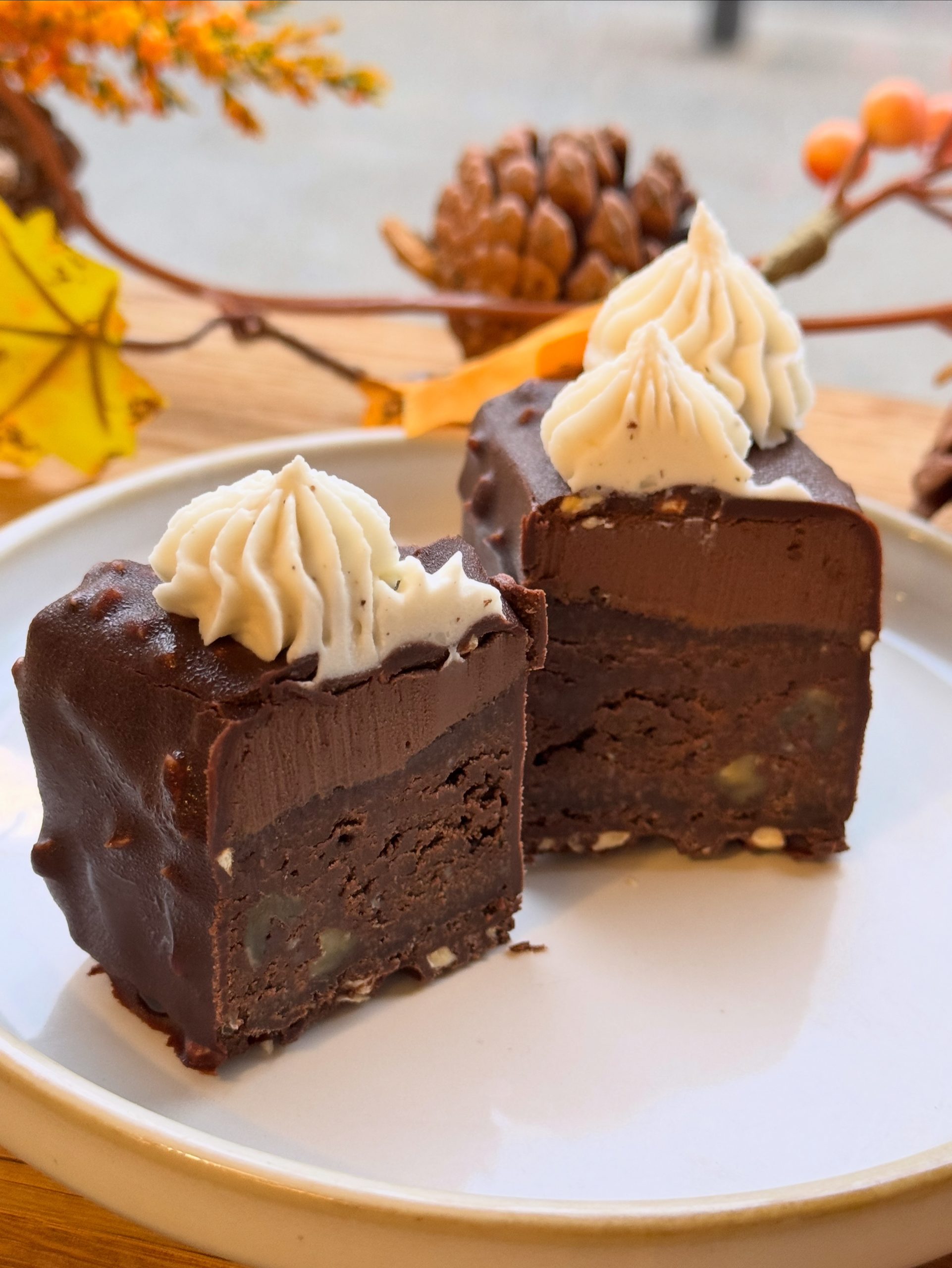 - Entremet de fêtes 100% chocolat composé d’une base brownie fondant, crème au chocolat, enrobage rocher aux noisettes (sans gluten).